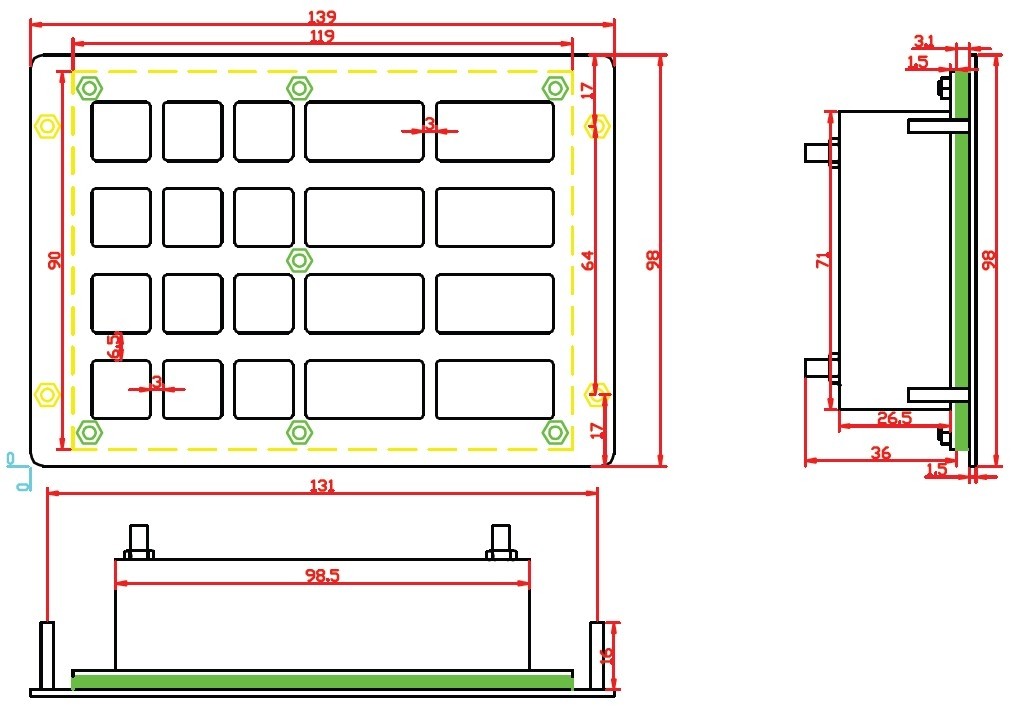 ·         20按鍵: 0,1,2,3,4,5,6,7,8,9,.,+/-,Menu, Profile, Enter, ESC 和四個方向鍵, 5 x 4 矩陣掃描.